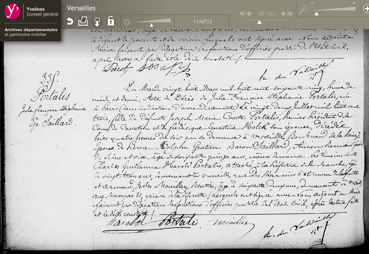 | Décès du grand-père maternel | Joseph Marie, « Charles » comte PORTALIS 5 août 1858 (Âge 33 ans) Détails de la citation : Fichier alphabétique des actes reconstitués, registre V3E/D 1220 |