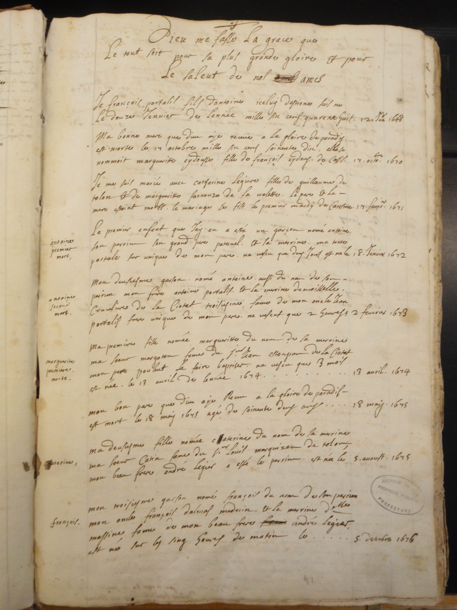 | Décès | 14 octobre 1670 Livre de raison de François Portalis Note : Première des deux pages du livre de raison de François Portalis où il relate les naissances et décès dans la famille. Livre de raison de François Portalis Note : Seconde des deux pages du livre de raison de François Portalis où il relate les naissances et décès dans la famille. |