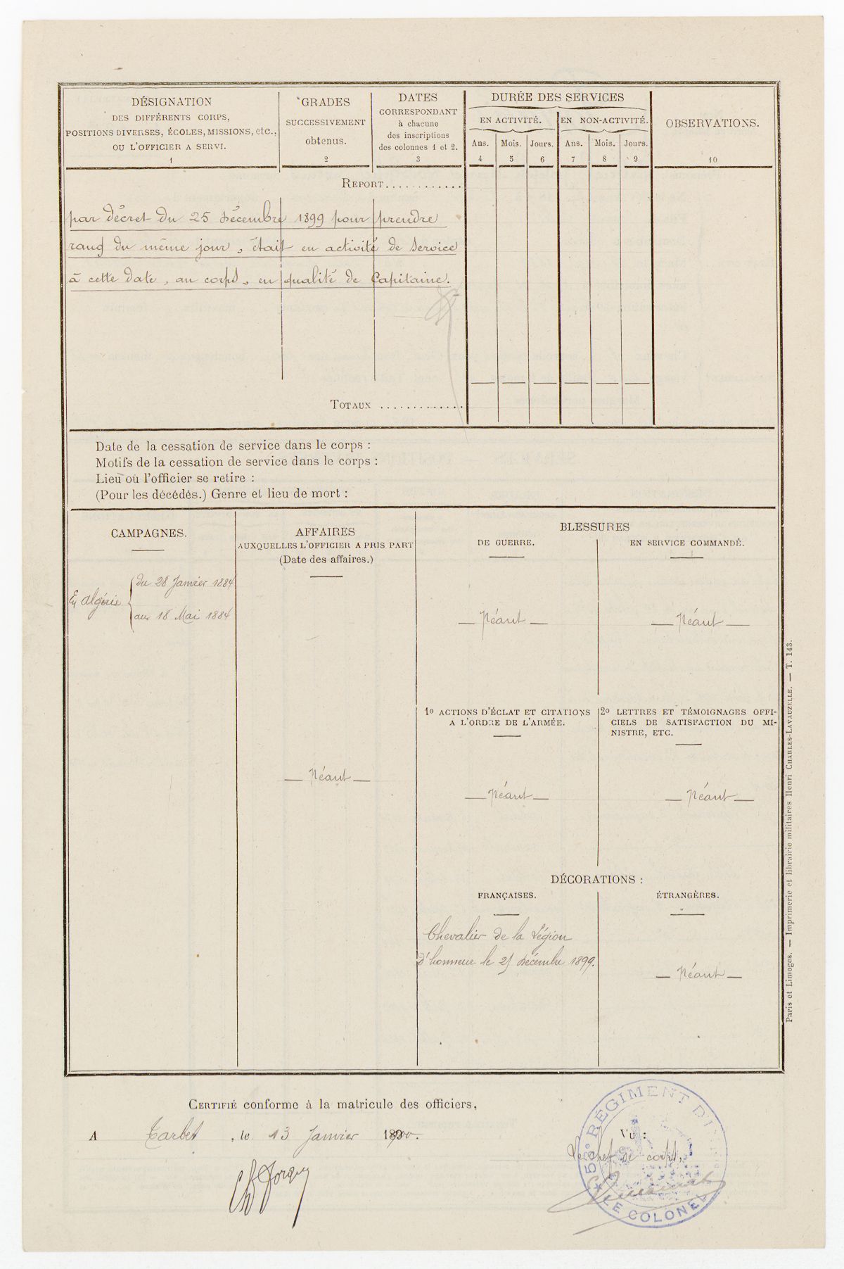 | Profession | Chef de bataillon, infanterie Détails de la citation : Etat des services |