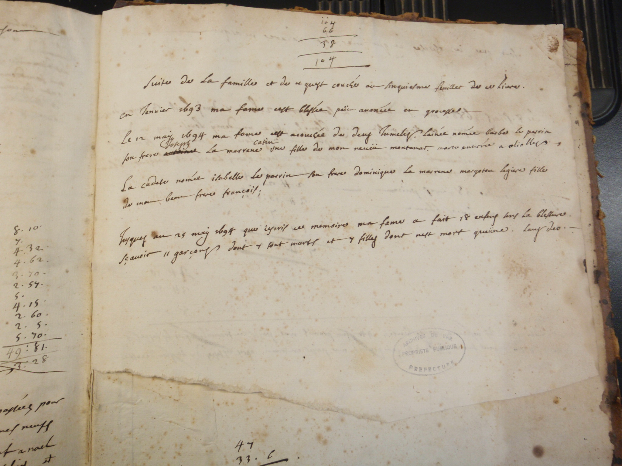Jusqu'au 25 may 1694 que () ces mémoires ma fame a fait 18 enfants sans la blessure savoir 11 garçons sont 7 sont morts et 7 filles dont nest mort qu'une. Type: Photo |