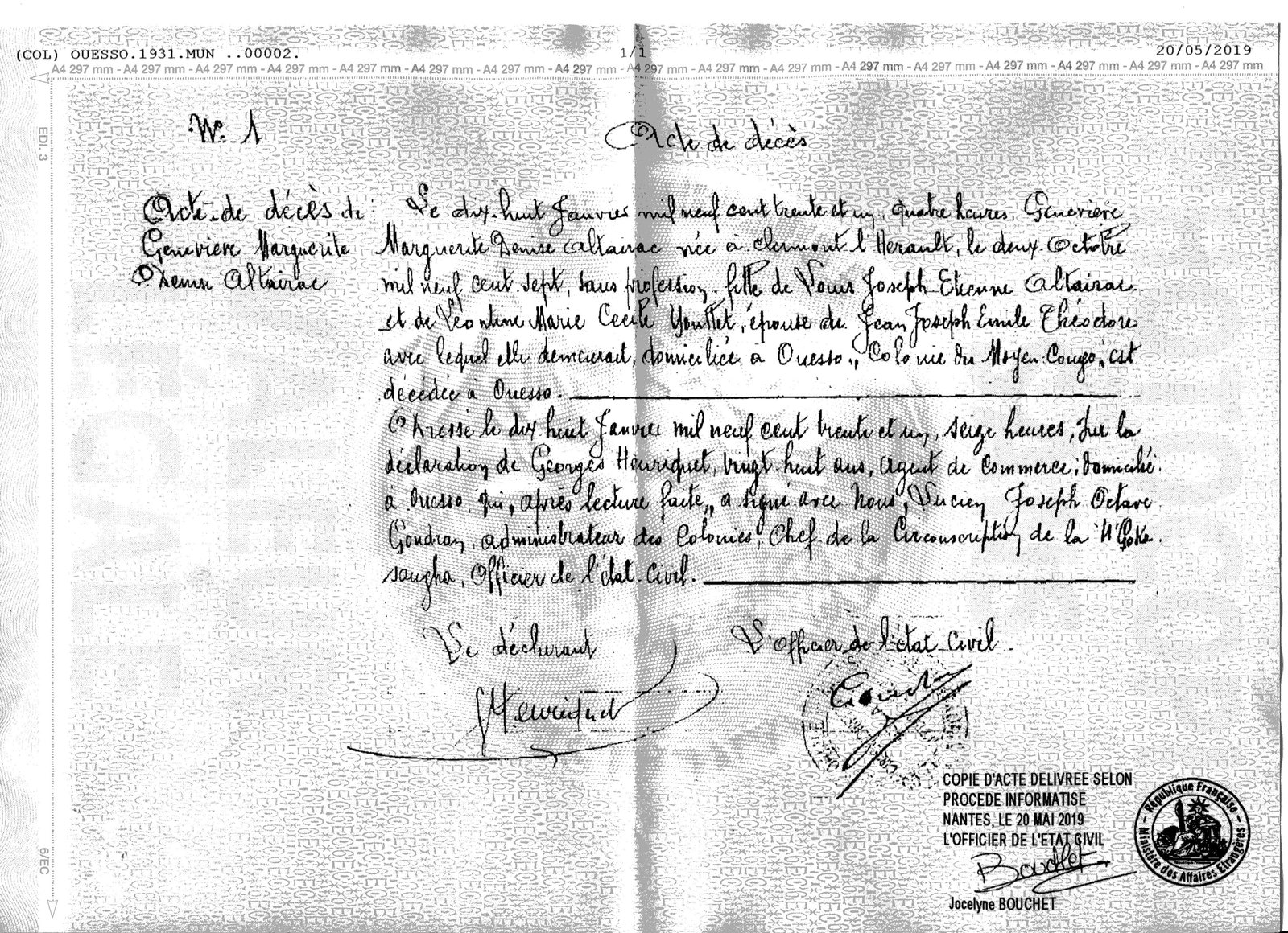 | Décès | Acte de décès de Geneviève Altairac-1931 |
