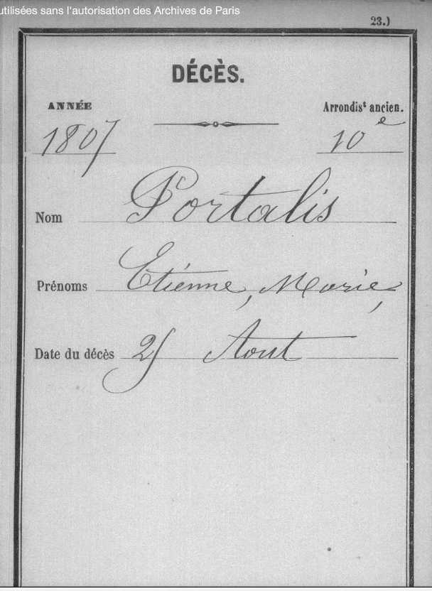 | AD75 - Acte de décès de Jean Etienne Portalis | 1 | 0 | 0 | 0 | January 13, 2014 - 11:16:15 a.m. | Delete |